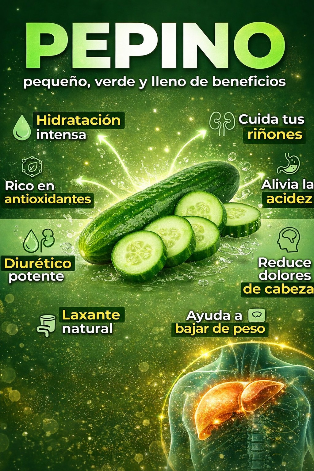 El pepino está compuesto en un 95% por agua, lo que lo hace ideal para mantener el cuerpo hidratado. También es rico en vitaminas A, C y K, y minerales como potasio y magnesio. Gracias a sus propiedades diuréticas, antioxidantes y depurativas, es un excelente aliado para la salud general.